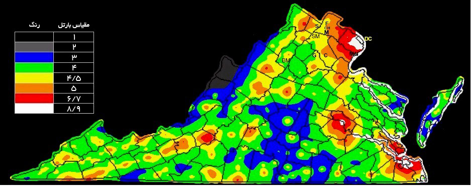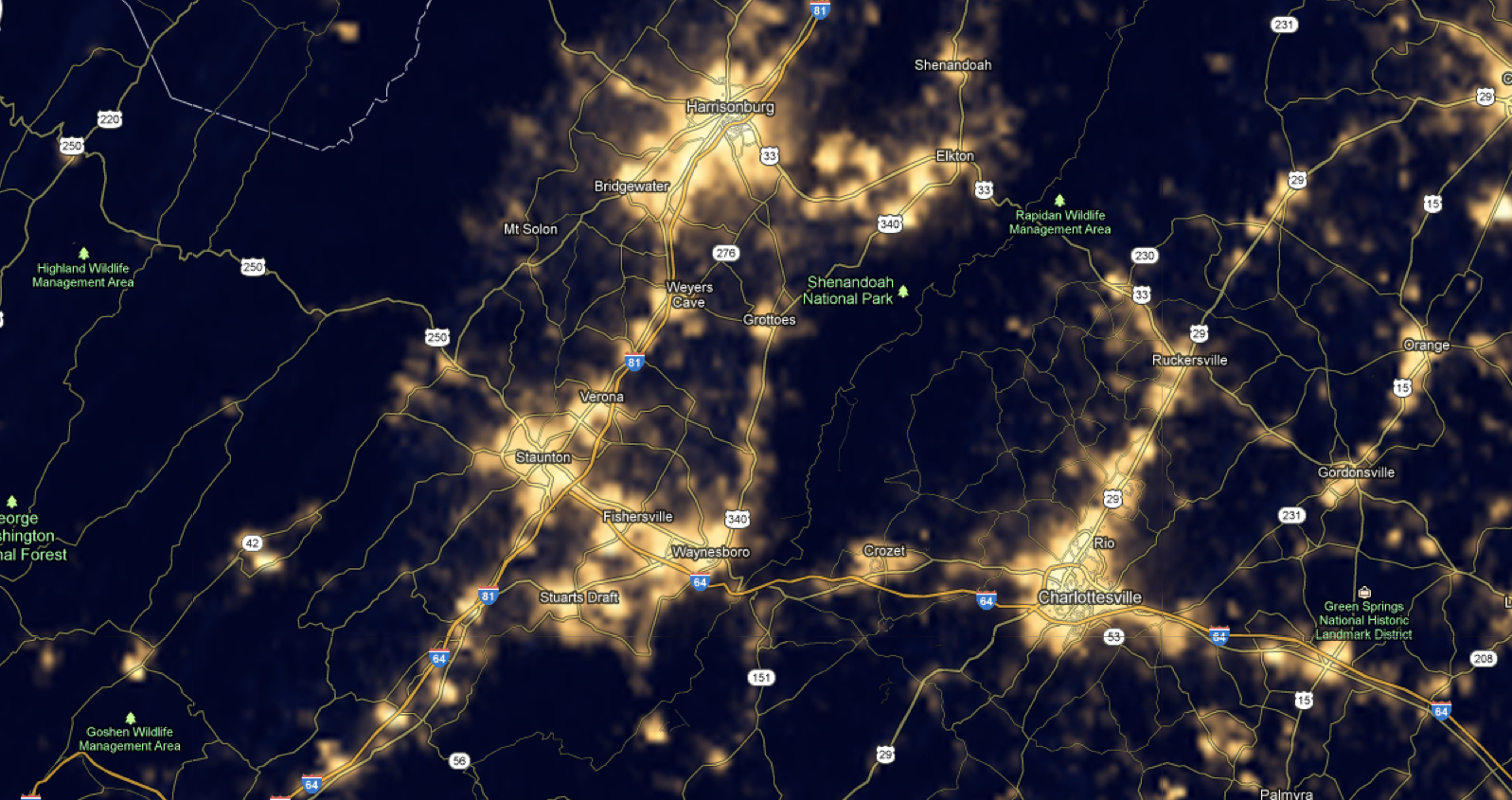 در تصویر دوم شما می توانید ببینید که آسمان چقدر بر فراز ویرجینیا روشن است .این محاسبه روشنایی آسمان بر اساس مقیاس بورتل اندازه گیری شده است.به عنوان مثال در نقاطی مقیاس عدد 9 را نشان می دهد ، نمی توان هیچ ستاره ای را در محل دید.در مناطق دارای مقیاس 5 فقط می توان ستاره های روشن تر را دید. در شهر دارای مقیاس 4 می توان ستاره نبولوسیتی از کهکشان راه شیرا را دید ، اما هیچ جا تاریک نیست و کهکشان راه شیری به اندازه ای که دو نسل قبل تر از ما می توانستند آن را ببینند روشن نیست.