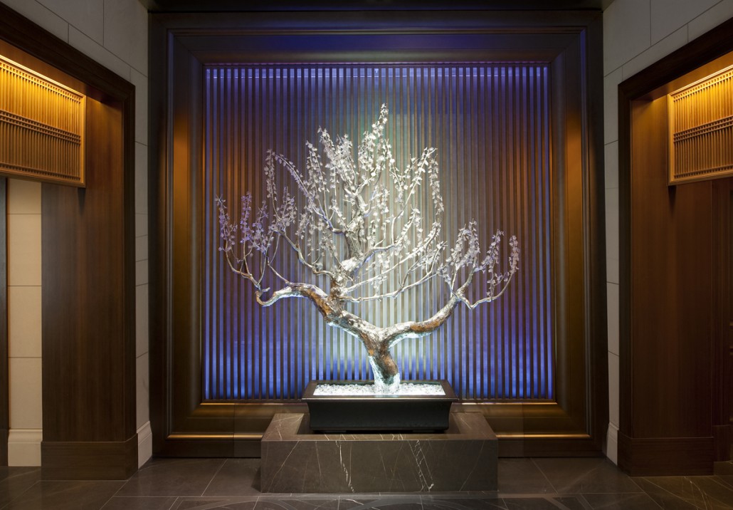 در نورپردازی درخت شاهد یک ترکیب فوق العاده از رنگ های سرد و گرم هستیم.درخت به عنوان یک عنصر مقدس در فرهنگ ژاپنی ، و به عنوان نماد درخت و شکوفه های گیلاس با پروژکتورهای مخفی و پرقدرتی به رنگ سفید در آمده است و به عنوان نقطه کانونی Focal Point چشم ها را به سمت خود جذب می کند.هاله زیبای آبی در پشت درخت علاوه بر ایجاد یک تضاد نرم و برجسته کردن سپیدی نور درخت باعث القای حس آرامش به مخاطب می باشد.نور آبی پس زمینه ،رنگ آبی محض ندارد و رنگی ترکیبی از آبی ، کمی طیف قرمز و کمی نور سپید دارد که یک آبی رویال و با ابهت را نتیجه می دهد.همین طور تضاد نور گرم محیط و متریال های چوبی طرفین به برجستگی بیشتر موضوع اصلی کمک می کند و درخت میانی را بیش از پیش بارز و نمایان می کند.